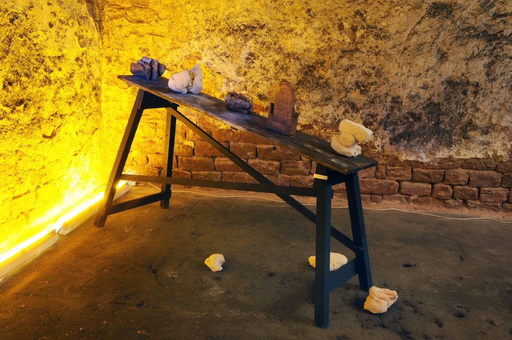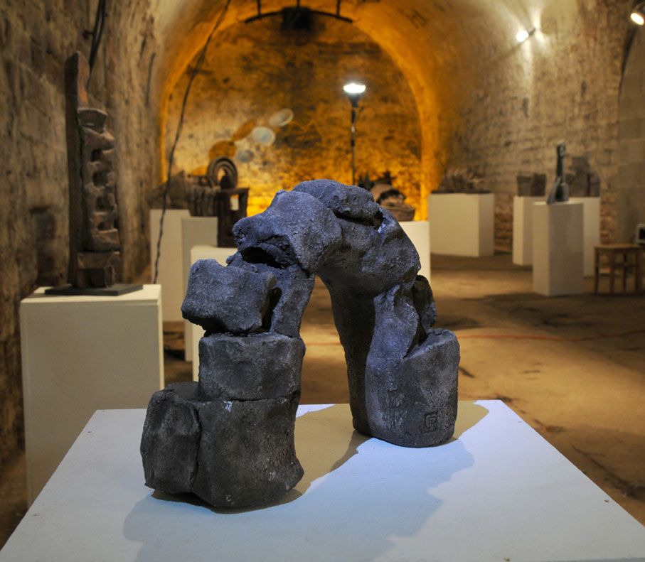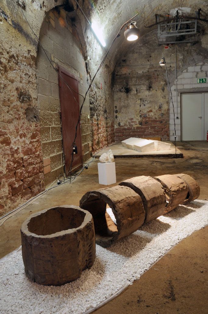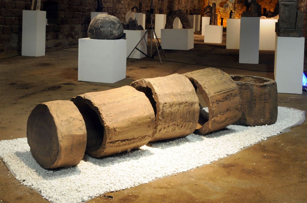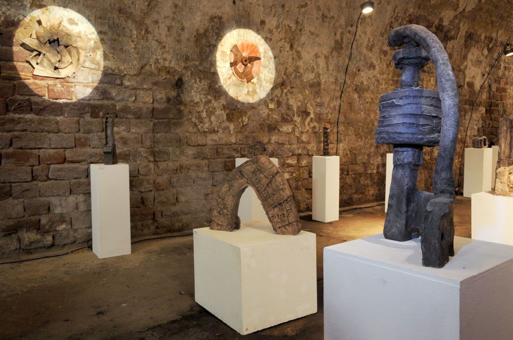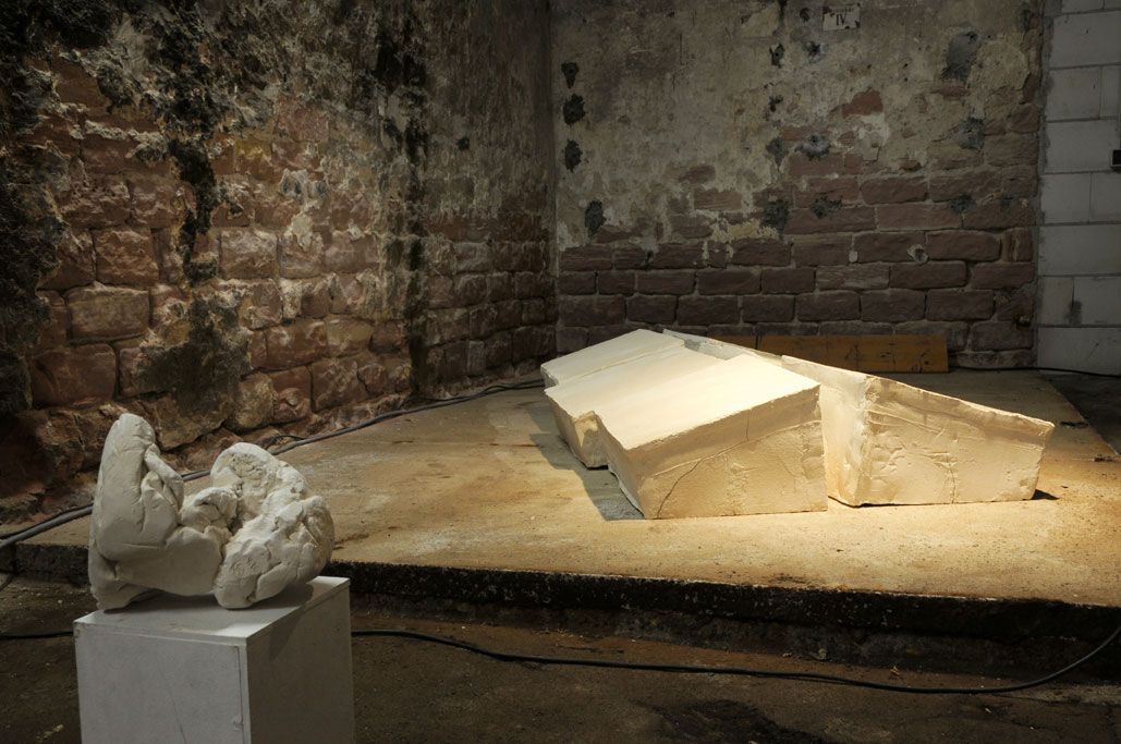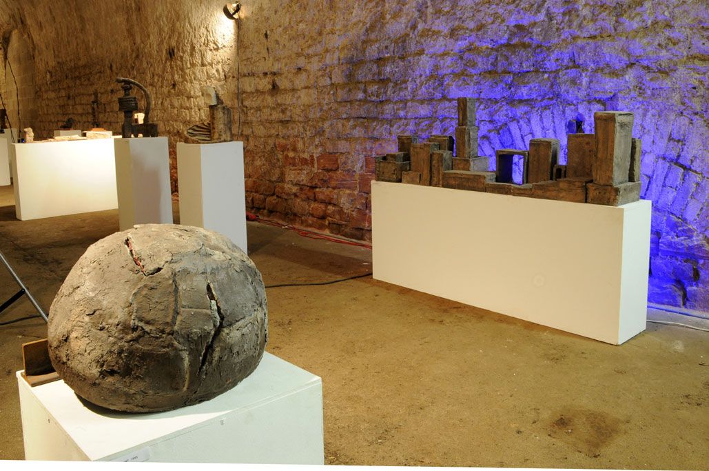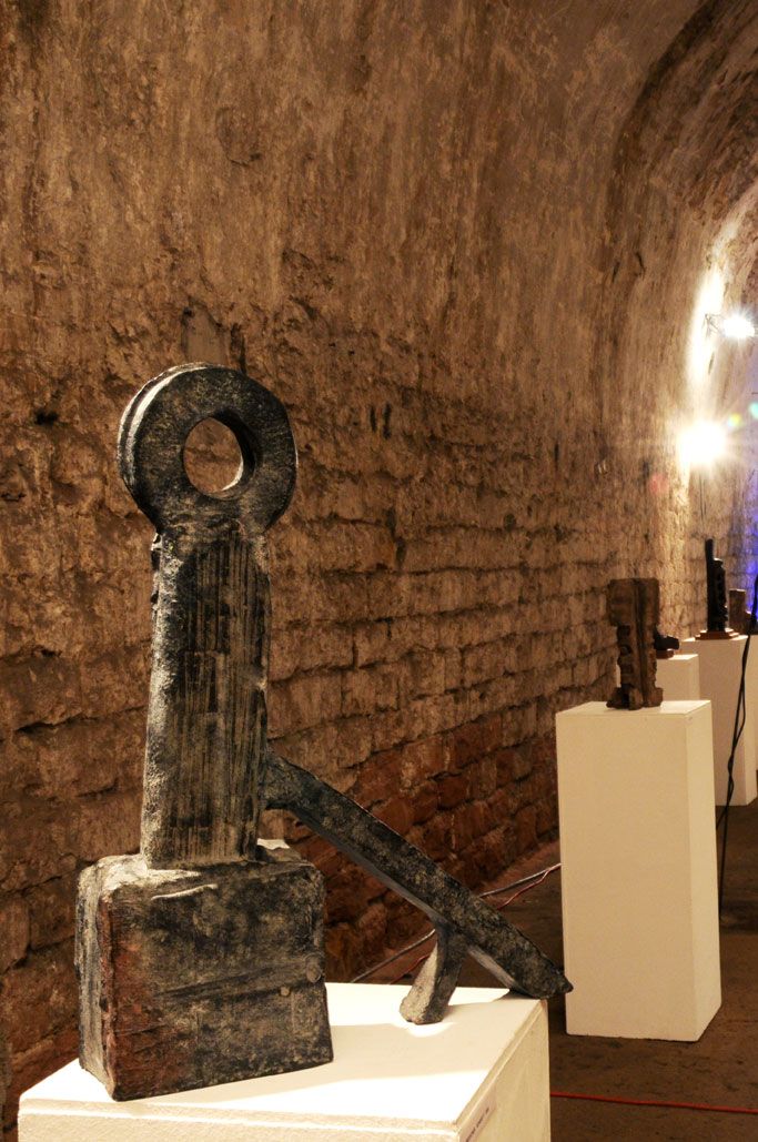 Im Gewölbekeller werden 40 Stücke präsentiert, also im Schnitt 2 für jedes Jahr. Seine erste Skulptur von 1991 nennt Gerd Reutter prompt ERSTE ARBEIT, die 3 letzten großen von 2010 haben die Titel VERSCHIEBUNGEN, UMSTURZ und ALLES IM WASSER. Sie liegen bzw. stehen unübersehbar im Eingangsbereich des Gewölbekellers.