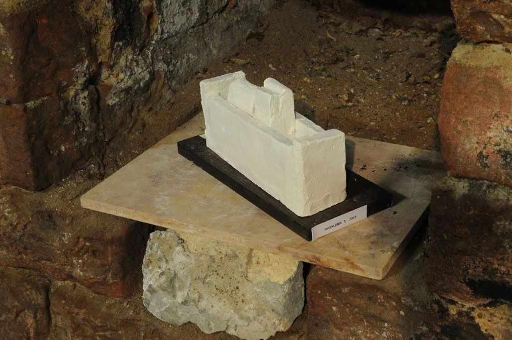 Die jetzige Ausstellung zum 80. Geburtstag des Künstlers hier im Gewölbekeller ist wunderschön und gekonnt aufgebaut – selbst kleine Wandnischen sind einbezogen, in die Gerd Reutter schneeweiße Stücke seiner ersten Edition INNENLEBEN aus dem Jahre 2009 eingestellt hat –, so dass die Betrachter und Begeher dieses Ensembles das Gefühl haben, „to be in the sculpture“.