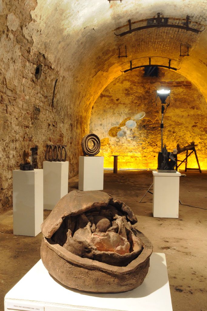 Heute nun findet in herrlich symbolischer Übereinstimmung wiederum in einem wunderbaren Gewölbekeller – dieses Mal in jenem der “Alten Brauerei“ aus den 1880er Jahren – DAS statt, was ich als ZWISCHENBILANZ bezeichnen möchte, also das, was sich als Substrat aus 20 Jahren künstlerischen Schaffens präsentiert:
