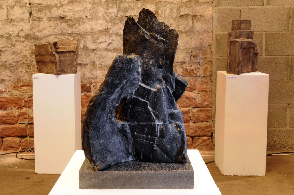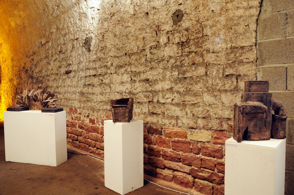 Im Gewölbekeller werden 40 Stücke präsentiert, also im Schnitt 2 für jedes Jahr. Seine erste Skulptur von 1991 nennt Gerd Reutter prompt ERSTE ARBEIT, die 3 letzten großen von 2010 haben die Titel VERSCHIEBUNGEN, UMSTURZ und ALLES IM WASSER. Sie liegen bzw. stehen unübersehbar im Eingangsbereich des Gewölbekellers.