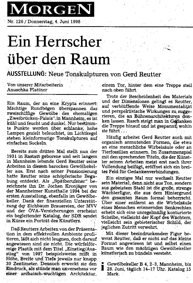 Der Mannheimer Morgen schreibt 1998 über die dritte Ausstellung Gerd Reutters im Mannheimer Gewölbekeller.