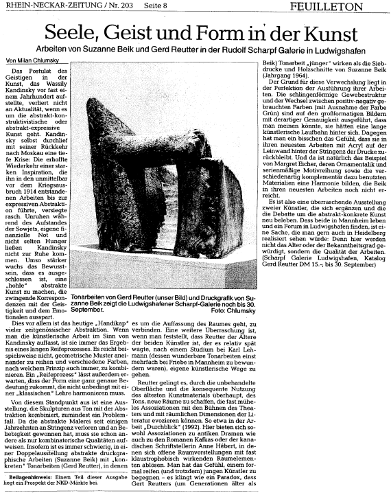 Die Rhein-Neckar-Zeitung bespricht 2001 die Ausstellung von Gerd Reutter und der Malerin Suzanne Beik in der Rudolf Scharpf Galerie in Ludwigshafen.