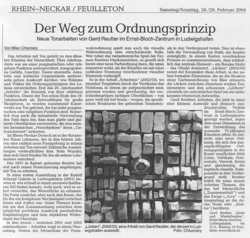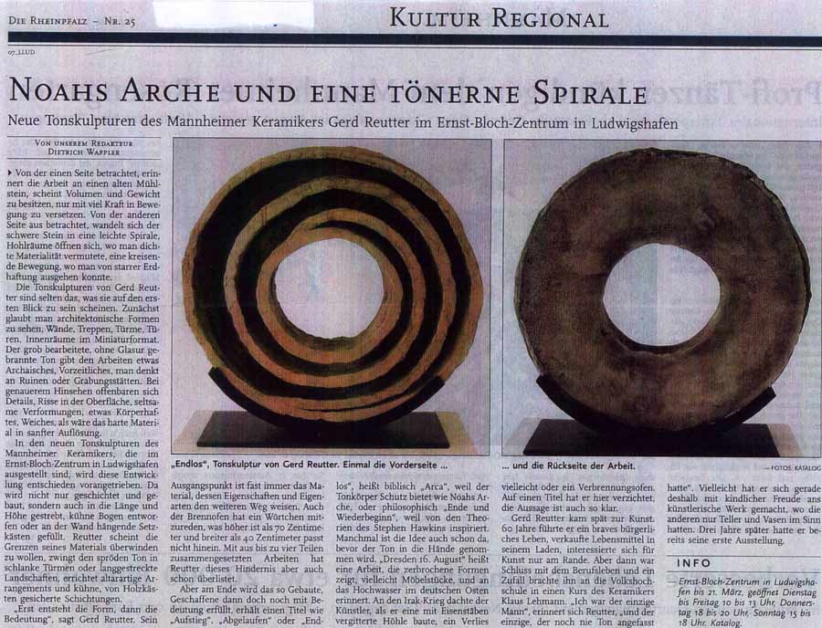 Über Gerd Reutters Ausstellung "Ende und Wiederbeginn" im Ernst-Bloch-Zentrum Ludwigshafen berichtet 2004 die Rheinpfalz.