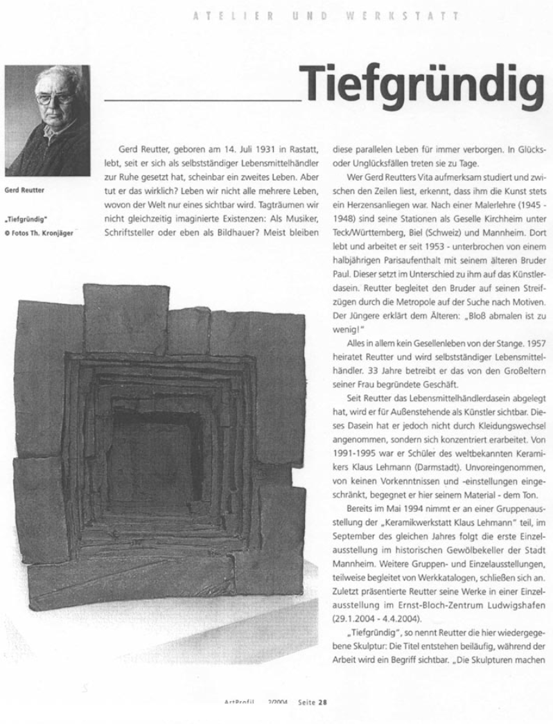 Das Fachmagazin für aktuelle Kunst ART-PROFIL portratiert in Heft 2, 2004 Gerd Reutter und sein Werk TIEFGRÜNDIG.