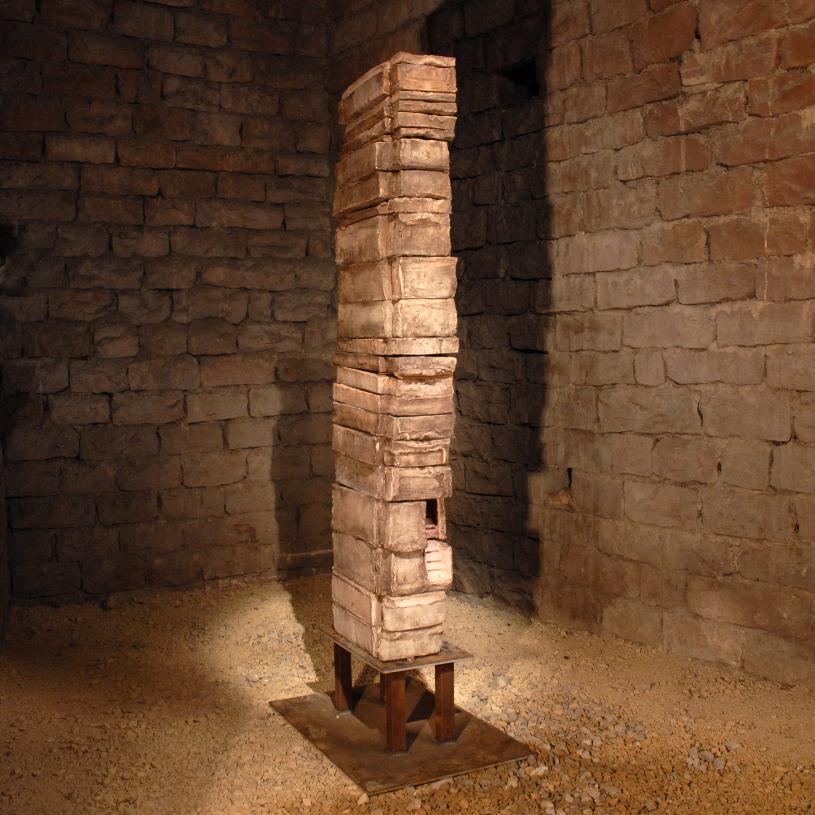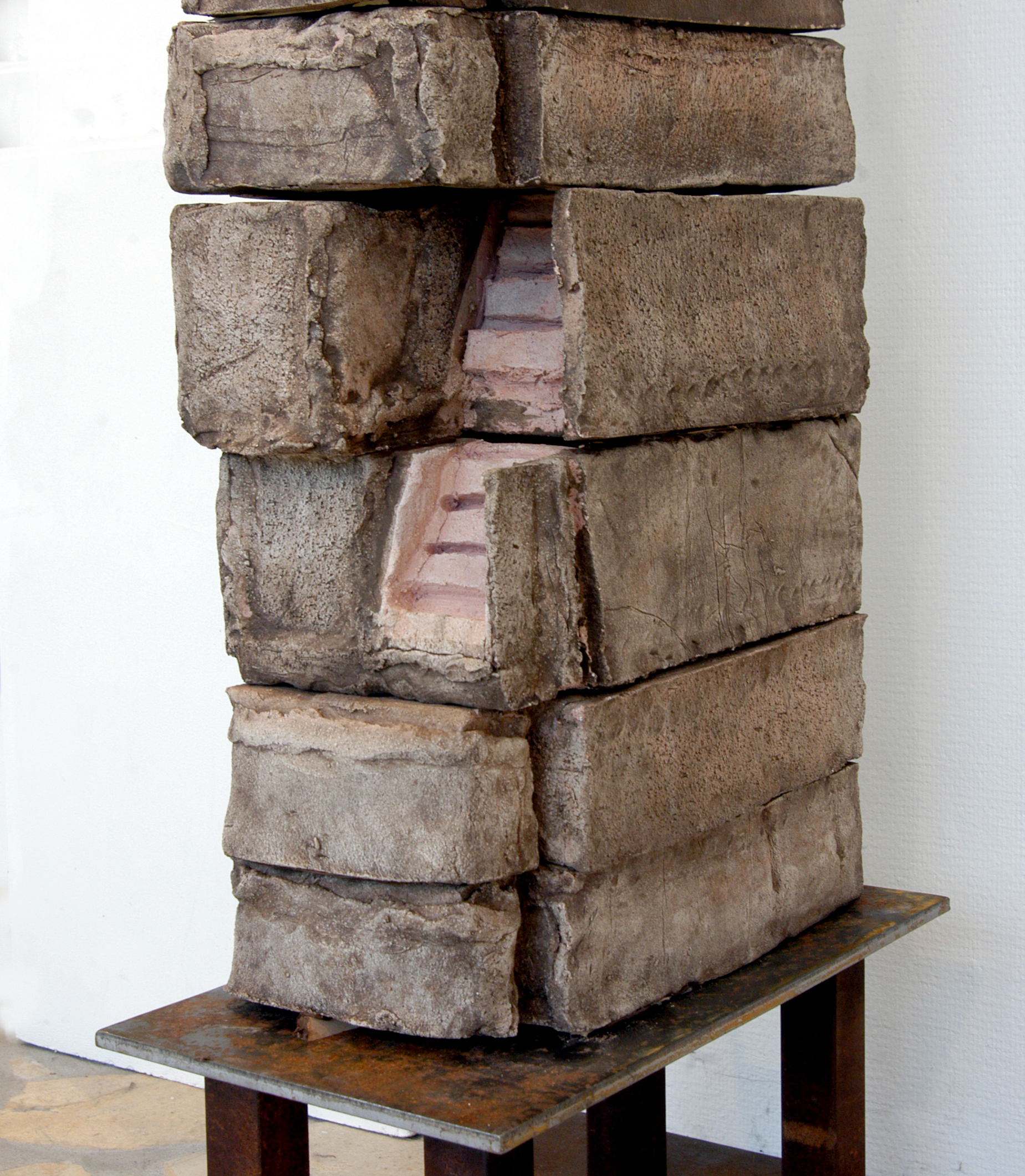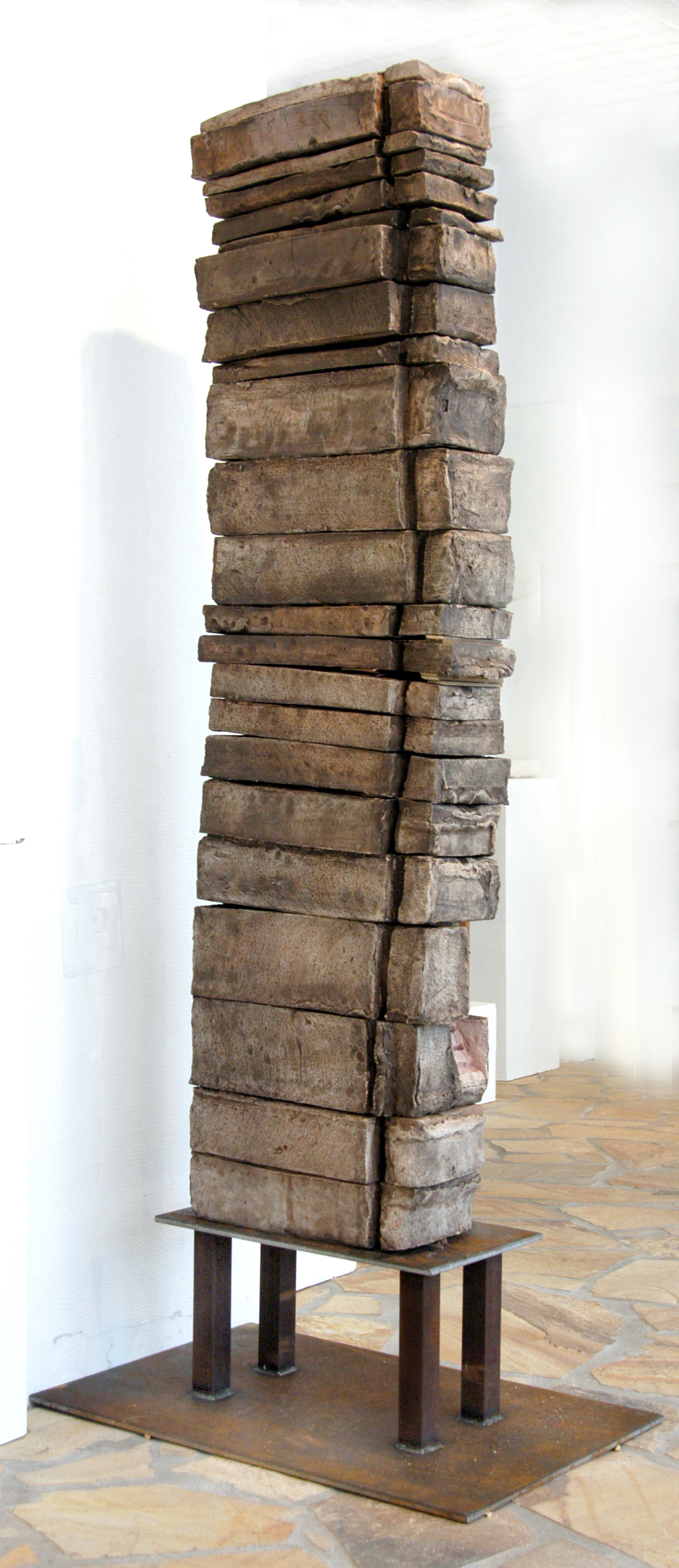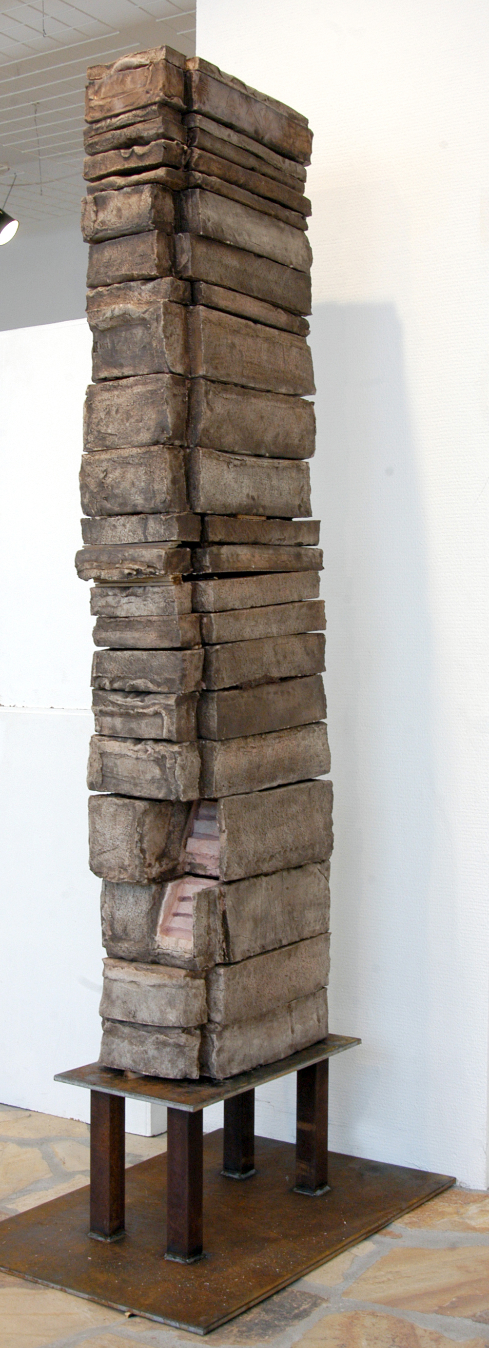»Mit dieser Schichtung schafft Gerd Reutter eine 1,85 m hohe Plastik mit Einem in sich leicht bewegten, lebendigen Umrisskontur, der durch die Unterschiedliche Farbigkeit der einzelnen Quader noch unterstrichen Wird. Die geschlossene Form der Arbeit wird nur durch eine Treppe im Unteren seitlichen Teil aufgebrochen, die ins Innere zu führen scheint Ohne dem Betrachter aber wirklich Einblicke zu gewähren. Mit diesem Werk eröffnet sich der Künstler neue gestalterische Möglichkeiten. Man kann vermuten, dass sie den Beginn einer neuen Phase in seinem Schaffen bezeichnet.«