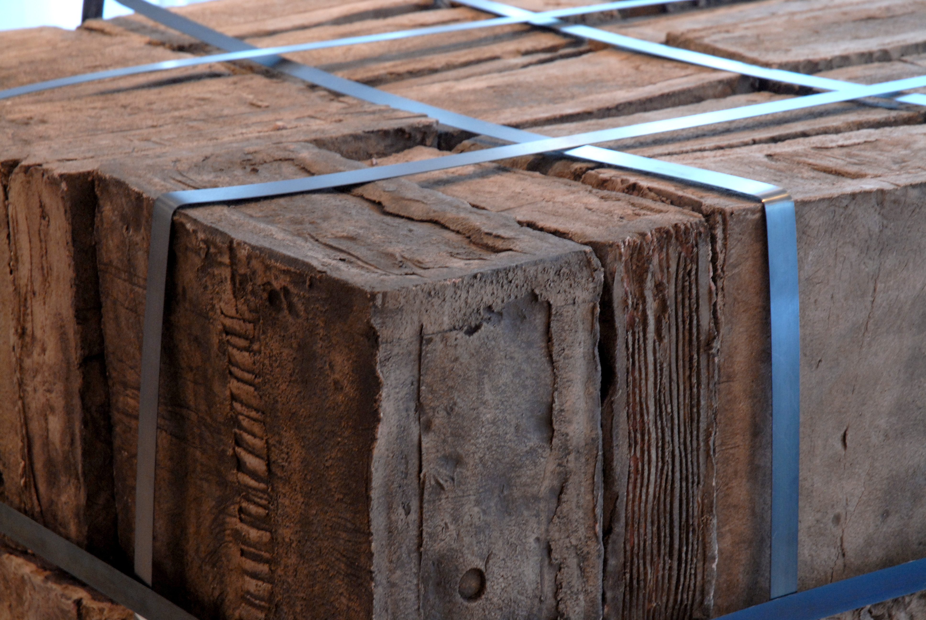 »Im Jahr 2006 entstand die große würfelförmige Plastik „O.T.(Kammer IV)“. Auf einem sockelartigen Eisengestell schichtet der Künstler verschieden große, aus Tonplatten mit unterschiedlichen Oberflächenstrukturen aufgebaute Quaderformen in drei Schichten zu einem Würfel mit einer Kantenlänge von 1m auf. Die Plastik wird in der Horizontalen und in der Vertikalen jeweils durch zwei Stahlbänder zusammengehalten. Sie geben dieser aus einzelnen Elementen aufgebauten Plastik Halt und Festigkeit. Zugleich erwecken diese Bänder den Eindruck des Unfertigen, als seien die einzelnen Quader nur zum Versand auf dem Sockel aufgeschichtet. Durch die unterschiedliche Größe der Kuben, aber auch durch die beim Brennen entstehen leichte Verformungen wird die strengestereometrische Form des Würfels aufgelöst und es entsteht eine lebendige Umriss- und Oberflächenstruktur. Auch in dieser Arbeit folgt Gerd Reutter seiner aus älteren Arbeiten Bekannten Vorgehensweise. Er stellt Tonplatten her, aber aus denen er die Für die Plastik bestimmten Kuben formt, die durch die unterschiedliche Strukturen der Oberflächen eine lebendige Wirkung entfalten.«