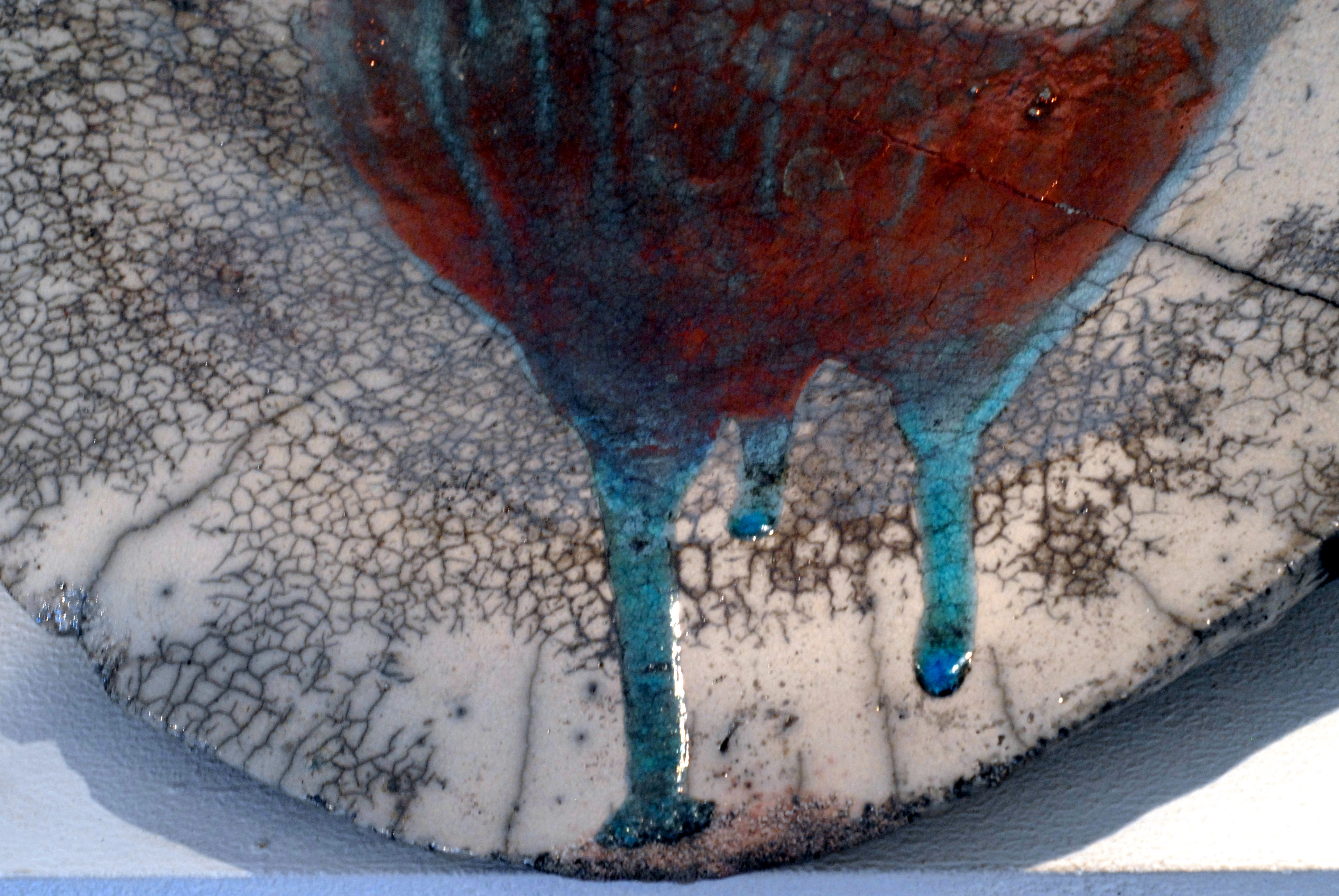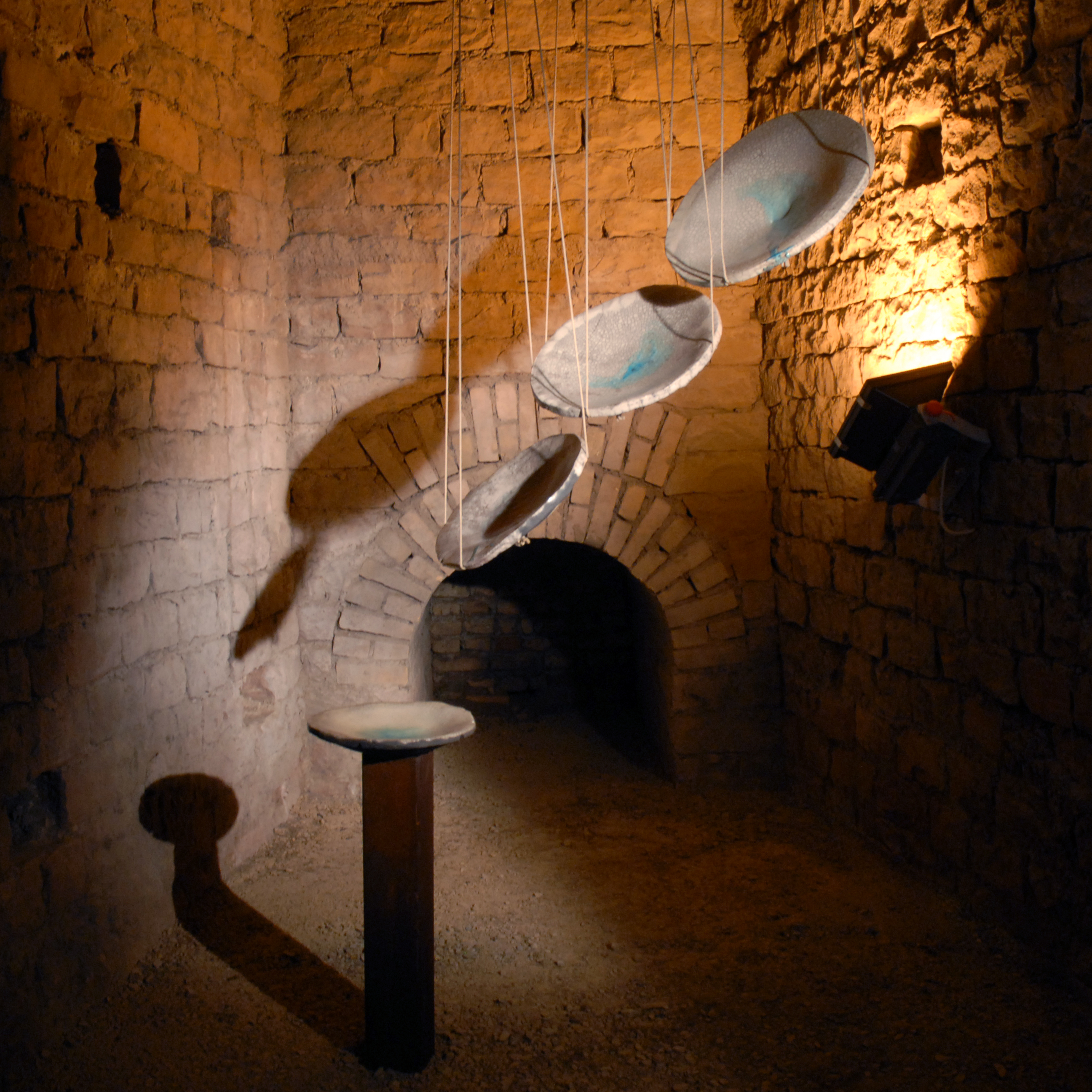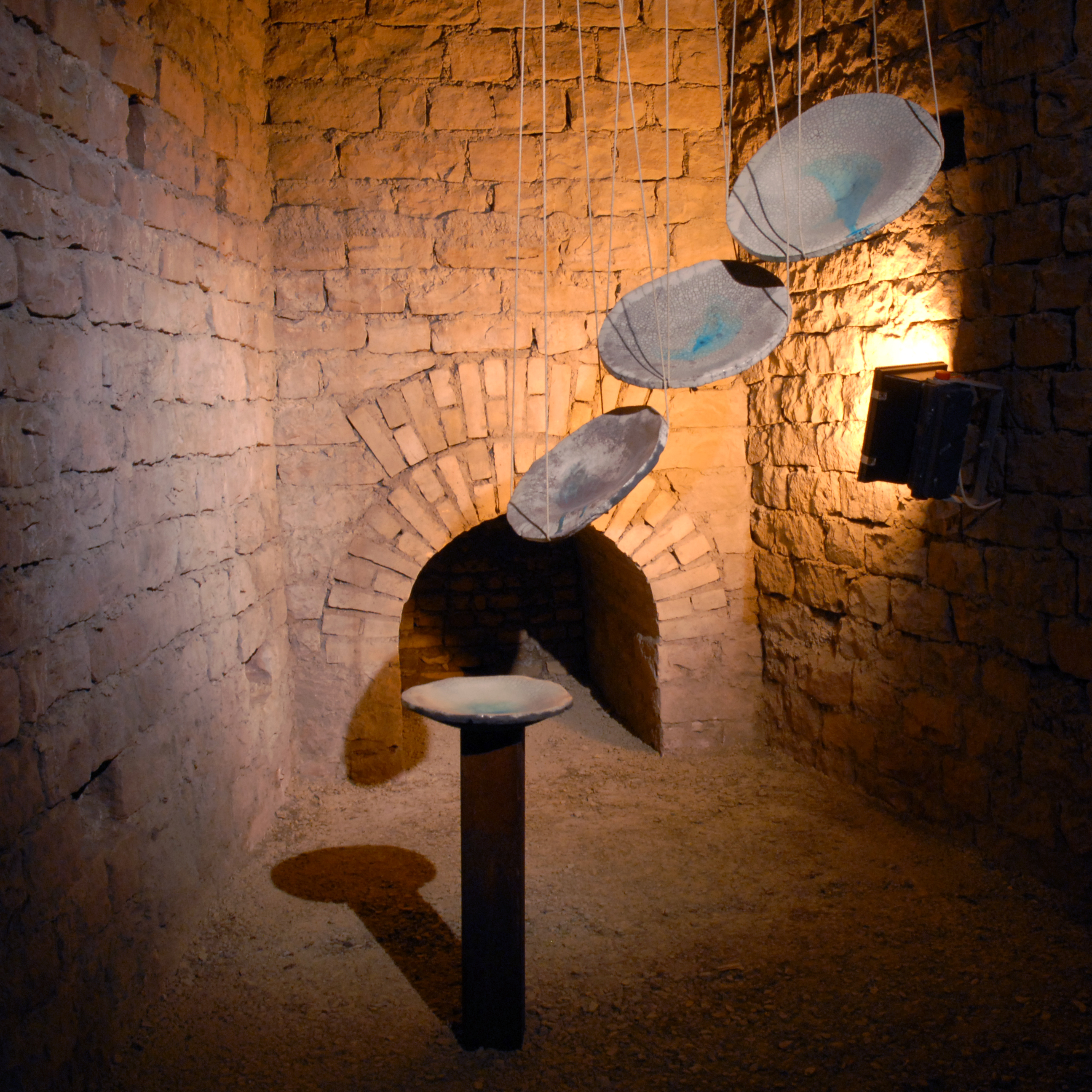 »…Gerd Reutters Schalen der vierteiligen Arbeit „Kammer II“ sind extrem dickwandig, sie sind flach und haben weder einen regelmäßigen Umriss noch eine gleichmäßige Wölbung. Dadurch wirken sie einerseits archaisch, andererseits lebendig. Sie sind offen und damit kommunikativ, sie verschließen weniger als sie offenbaren. Diese Eigenschaften sind auch die Erklärung dafür, dass Schalen häufig sakralen und rituellen Charakter besitzen. Reutters Schalen sind sehr groß, zu groß und schwer als dass sie ein Benutzer mit beiden Händen anheben könnte, um daraus zu trinken. Sie haben vielmehr symbolischen Charakter. Drei der Schalen hängen an Hanfseilen von der Decke herab, während eine auf einem Sockel steht. Sie sind derart angeordnet, dass die Vorstellung entsteht, imaginäre Tropfen könnten von oben kaskadenartig in die Schalen tropfen und sich schließlich in der horizontal stehenden sammeln. Die Vorstellung fließenden Wassers wird gesteigert durch die blau zerlaufenden Glasuren. So ist der dynamische Gedanke des Fließens nicht nur im besonderen Arrangement der Schalen gegeben, sondern auch in der formalen Gestaltung.«