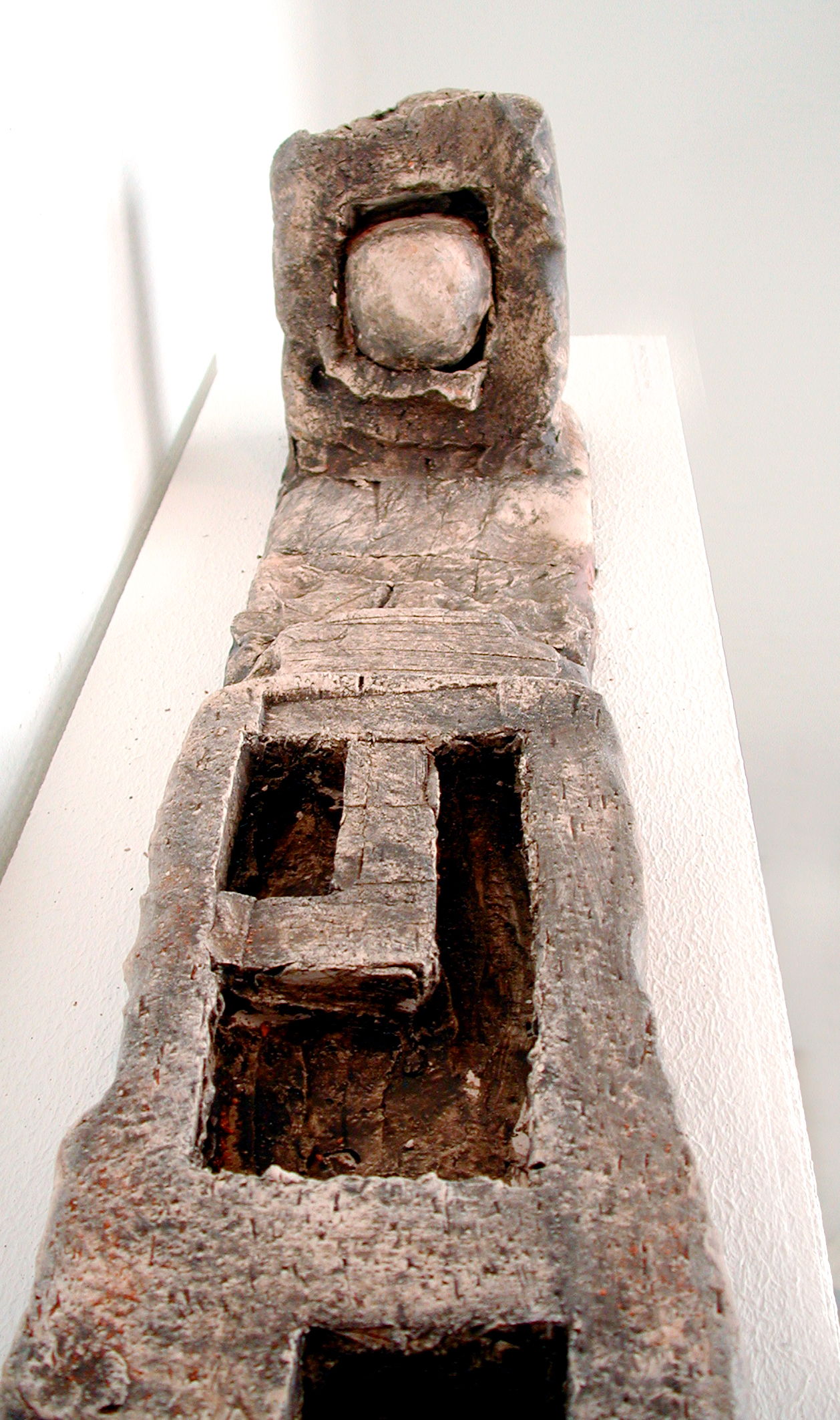 In Reutters Skulptur ist tatsächlich ebenfalls eine solche architektonisch-inhaltliche Verdichtung intendiert. Beginnend an dem von zwei pfeilerähnlichen Wangen flankierten, hochgelegten Absatz einer Treppe führen Stufen hinab auf eine Fläche, die der Höhe des Bodenniveaus entspricht. Diese Fläche führt zu einem flachgedeckten Schutzraum, der seinerseits zu einer niedrigen, grundrissähnlichen Aufschüttung mit tiefen, rechteckförmigen Einschnitten überleitet – auf unheimliche Weise suggeriert dieser Abschnitt eine Opfergrube. Es folgt wiederum eine Fläche, an deren Ende ein annähernd quadratischer, rahmenähnlicher Raumkörper steht, aus dem eine eingepasste Kugel herausragt.